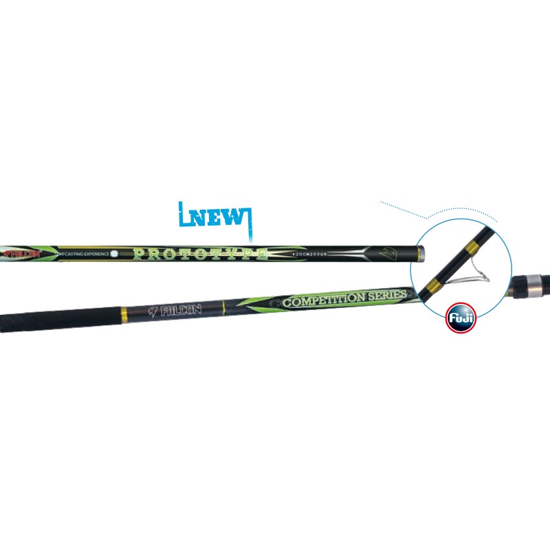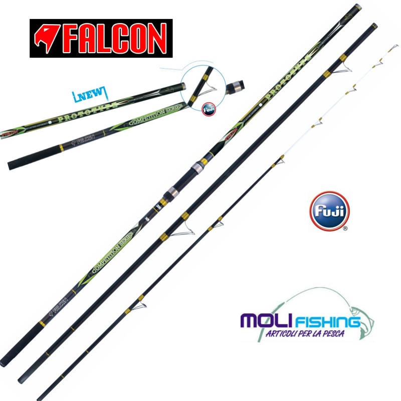 Realizzata in carbonio XR, e proposta nelle duplice versione da 4.20 m csting 200gr, la Falcon Prototype è montata con i classici anelli Fuji MN Series dal profilo LR. L’ azione del fusto è veloce, capace di offrire ottime performance e lunghe distanze in fase di lancio, presenta la vetta ibrida con la prima metà in carbonio pieno e tubolare nella seconda metà capace di garantire una notevole sensibilità anche nelle tocche più lievi.