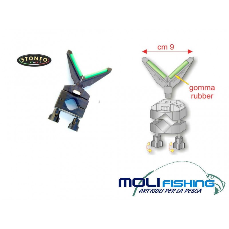 Appoggiacanna da barca con inserti in gomma, prodotto con materiale resistente agli urti e alla corrosione. Questo modello si applica alla battagliola della barca per mezzo di un morsetto con filettatura standard.
