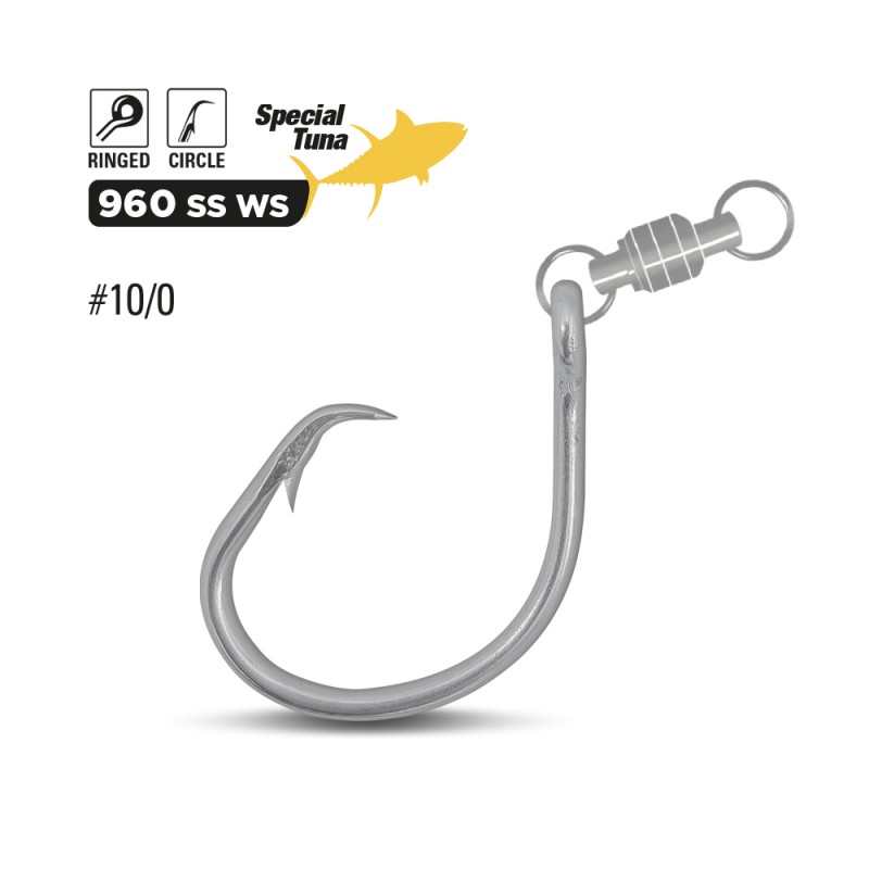 Amo per la pesca a drifting modello Circle con anello saldato in acciaio inossidabile con punta rientrante e girella che rende libero il movimento. Amo Jatsui 960 SS WS molto robusto ideale per la pesca a drifting al tonno rosso e big game.