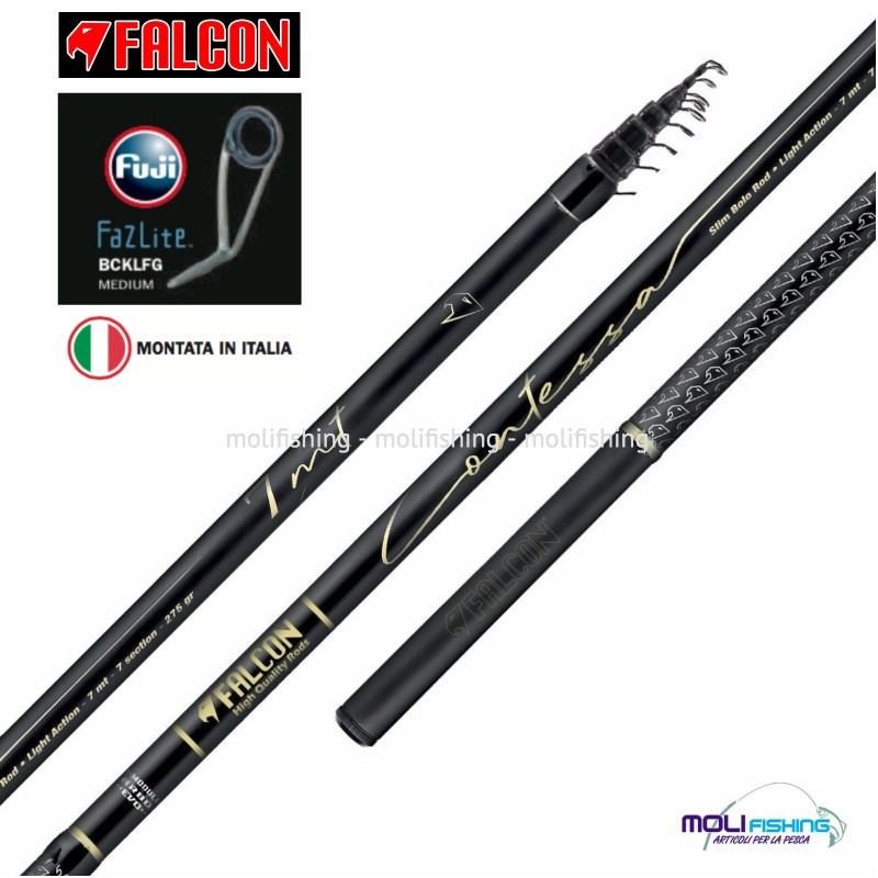 Il progetto che ha coinvolto il team di sviluppo Falcon viene presentato nel catalogo 2023 con una nuova rivisatazione: Falcon Contessa Slim Bolo Light Italia. La bolognese dal profilo sottile, ha un diametro alla base di 19 mm, per la versione da 6mt, e un diametro di 21 mm per la versione da 7 mt. ed è realizzata in carbonio di alta qualità a basso contenuto di resine EVO Hi Modulare Carbon. Un attrezzo rifinito, dalla grafica elegante e minimale, che da risalto alla qualità dei materiali utilizzati. Monta componentistica Fuji Fazlite BCKLFG Medium, dotata di freno in soft eva, alla base di ogni elemento, per evitare colpi quando la canna è chiusa, completamente montata in ITALIA si tratta del nuovo modello 2023