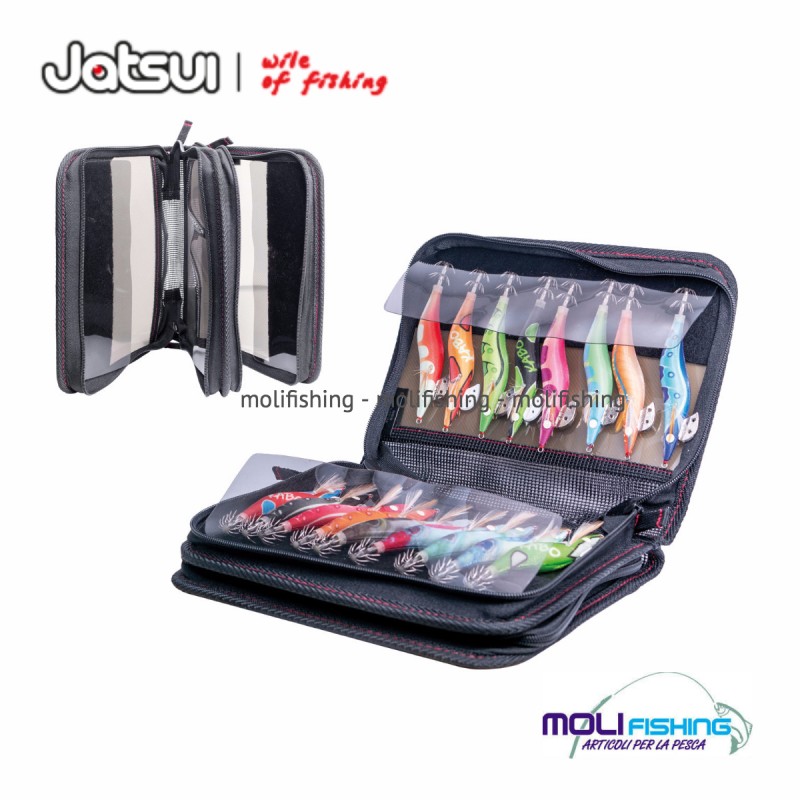 Una selezione di astucci dedicati allo stoccaggio di totanare e jig realizzati con materiali e finiture di ottima fattura. Jatsui propone due versione la L e la LW capaci di contenere rispettivamente 20 e 40 artificiali. Il fondo di questi astucci è realizzato in Mesh, materiale sintetico nato per utilizzi militari, che ha come caratteristica fondamentale la durevolezza, e che permette di resistere ad urti accidentali o forature dovute al contatto con gli affilatissimi cestelli delle totanare.