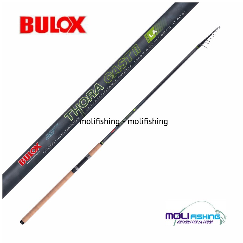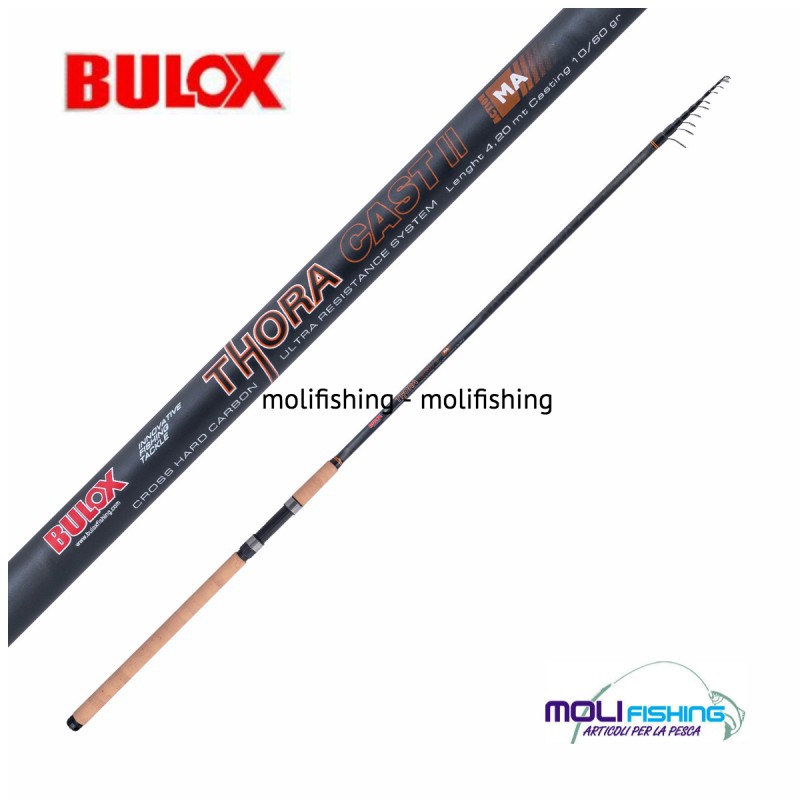 Bulox con la serie Thora propone attrezzi curati nei dettagli e funzionali, ad un incredibile rapporto qualità/prezzo. La Thora Cast, ultimo sviluppo del team Bulox rappresenta la nuova proposta tra le telescopiche dedicate alla pesca all'inglese. I tre fusti in tre diverse azioni, Light, Medium e Strong/action sono realizzati in carbonio intrecciato alto modulo riconoscibile dalla finitura a spirale incrociata ben visibile anche negli strati esterni del grezzo. Il manico in P-Cork garantisce una presa salda e naturale, la placca a vite permette di alloggiare anche mulinelli Big Size. L'azione parabolica, permette di eseguire lunghi lanci ed il suo fusto dotato di una schiena molto robusta garantisce alte e divertenti prestazioni nei combattimenti con prede di taglia.