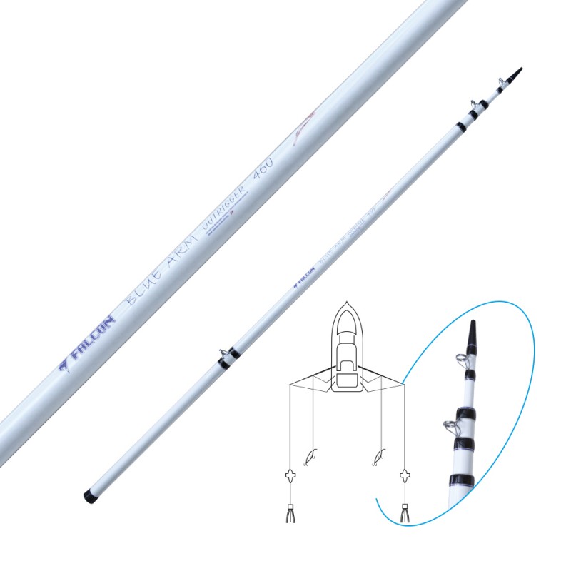Il divergente Blue Arm Outrigger è un attrezzo telescopico che trova utilizzo nella traina d'altura con lo scopo di divaricare le lenze delle canne più esterne. L'impigo dell'Outrigger di Falcon permette grazie alla sua azione morbida di indurre i nostri Kona o Bubble verso un movimento estremamente sinuoso ed adescante.