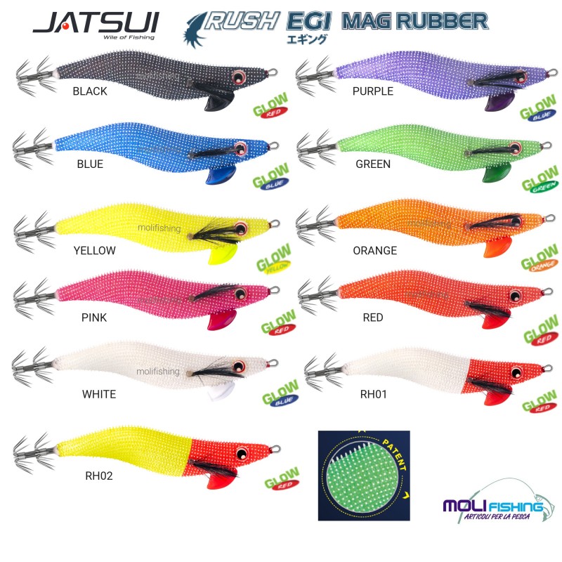 Dalla combinazione della tecnologia Mag e Jatsui Rubber Cloth, nasce la serie Jatsui Rush Egi Mag Rubber che vede applicate alle totanare nella misura 3.0e 3.5 il sistema di bilanciamento magnetico in combinazione con il rivestimento siliconico Jatsui Rubber, al fine di creare un bellissimo crossover di bilanciamento a cui si aggiunge la combinazione di colori espansa in modalità glow quando sottoposta all'illuminazione delle lampade UV.