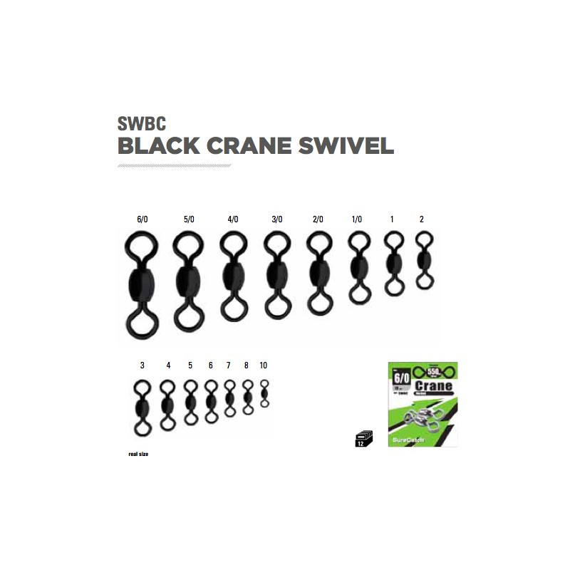 SureCatch girella Black Crane Swivel molto resistente. Grazie alle 15 misure disponibili può essere utilizzata in tutte le tecniche di pesca come la bolognese, il surf casting, il bolentino, la traina.