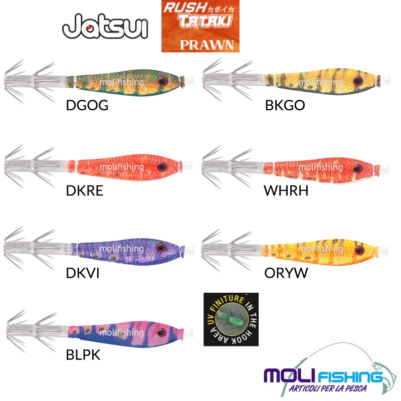 Il Rush Tataki Prawn, è un esca estremamente catturante, caratterizzata da un nuoto sinuoso, capace di attrarre i cefalopodi sia nelle ore diurne che notturne grazie al loro corpo Glow in diverse colorazioni.