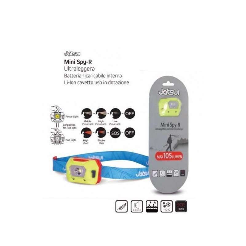 La lampada da testa Jatsui Mini Spy-R è confezionata in blister singoli, leggera, ricaricabile; 105 Lumen di potenza, resistente all'umidità, al freddo fino a - 10°C. La lampada possiede 3 diverse intensità: Alta, Media e Bassa, in più sul retro è posizionata una comoda luce Rossa per essere sempre visibile.