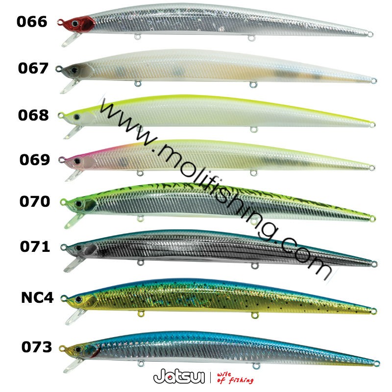 Long Jerk top di gamma della linea Jatsui Sea Slicker, dotato di particolari che lo rendono un jarkbait totalmente rivoluzionario rispetto agli altri. É disponibile in 8 colorazioni che variano da livree naturali e realistiche, fino a colori estremamente visibili. Progettato e costruito per lanci a lunga distanza , a tal fine è stato dotato di particolari pesi mobili in lega di tungsteno. Appena in acqua riesce ad entrare subito in pesca rispondendo in modo fulmineo ad ogni sollecitazione della canna, possiede una grande stabilità anche in presenza di correnti laterali e si presta in maniera eccellente a qualsiasi tipo di recupero, perfino a quelli più frequenti con continue jerkate. Il rollio creato dal bilanciamento e il successivo riposizionamento in asse, a seguito della jerkata, garantiscono un nuoto estremamente naturale e decisamente catturante.
