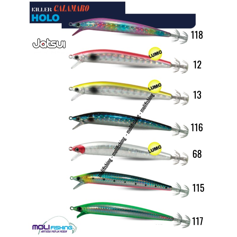 Artificiale progettato per la pesca ai calamari a traina con l'utilizzo dell'affondatore, adatto anche per l'utilizzo con montatura a bandiera su braccioli multipli, inoltre ha dato ottimi risultati anche utilizzato a spinning da terra. Si tratta di un artificiale molto catturante grazie ai colori accesi ed all’eccezionale nuoto, fin dalle basse velocità. Infatti vengono utilizzati senza nessuna difficoltà con il piombo guardiano (alla velocità circa ad 1 kn) e con l’affondatore idrodinamico tipo (steam) alla velocità di circa 2 kn o 2,5 kn. Rimarrete estasiati dalla grande funzionalità dell’artificiale.