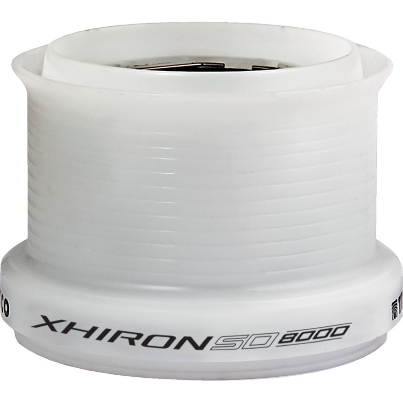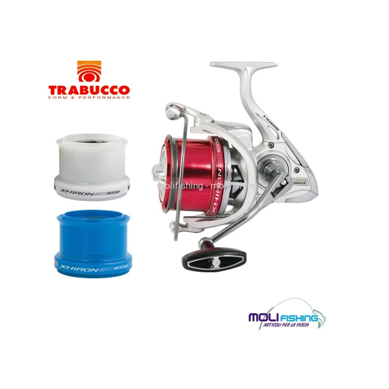 Trabucco XHIRON SD 8000 è un mulinello dedicato alla pesca a Surfcasting, presenta in corpo e rotore in grafite indurita X-Tra Tough che lo rende molto leggero, solo 550 gr, e allo stesso tempo molto robusto. Monta ben 6+1 cuscinetti a sfere sigillati Long Life in acciaio inox, anche l'alberino è in acciaio inox a sezione maggiorata, imbobinamento a spire incrociate, lenta oscillazione verticale della bobina, monta la bobina è in alluminio di classe aerospaziale ed inoltre ne vengono fornite altre due supplementari in PTFE, l'archetto è a sezione maggiorata ed il rullino guidafilo è in Titanio.