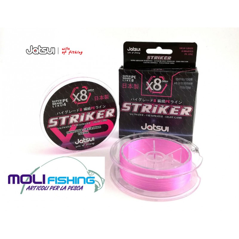 Striker X8 della Jatsui è un trecciato PE puro di altissima qualità, estremamente morbido e decisamente leggero, caratteristica che ne garantisce elevate prestazioni nel lancio ed in pesca. La tessitura dei capi è estremamente compatta così da ottenere un trecciato ultra sottile anche nei libraggi più elevati.