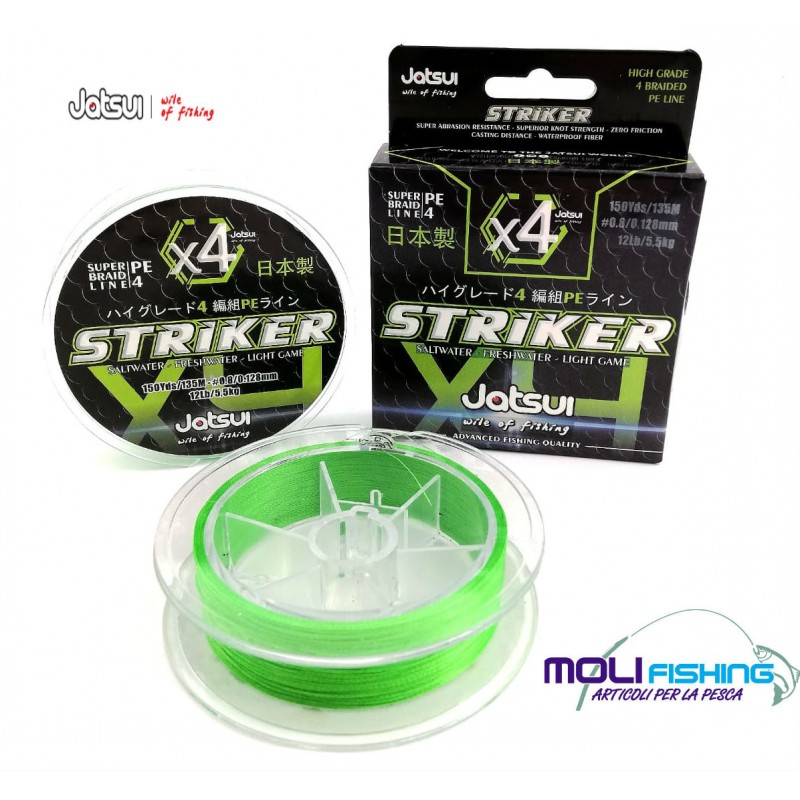 Striker X4 della Jatsui è un trecciato PE puro di altissima qualità, estremamente morbido e decisamente leggero, caratteristica che ne garantisce elevate prestazioni nel lancio ed in pesca. La tessitura dei capi è estremamente compatta così da ottenere un trecciato ultra sottile anche nei libraggi più elevati.