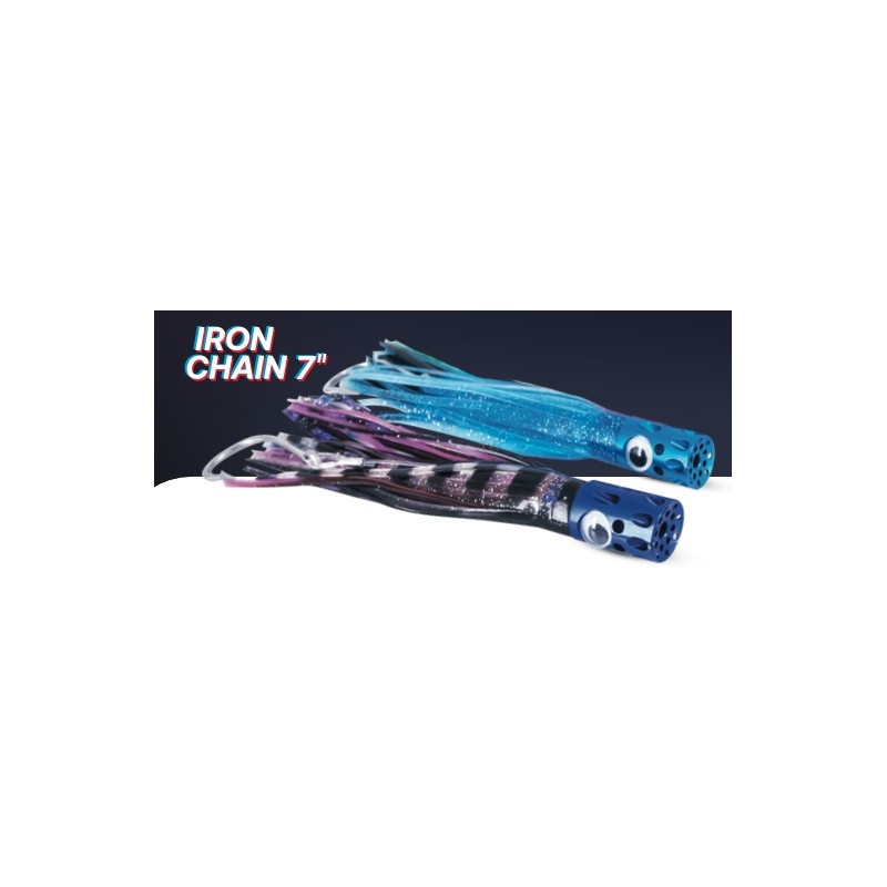 IRON CHAIN è un octopus con testa in ottone forata in grado generare una scia molto attraente grazie alle bolle e ai rumori emessi dai fori presenti, con corpo in silicone della lunghezza di 17.7 cm ed è armato con filo ed amo Mustad.