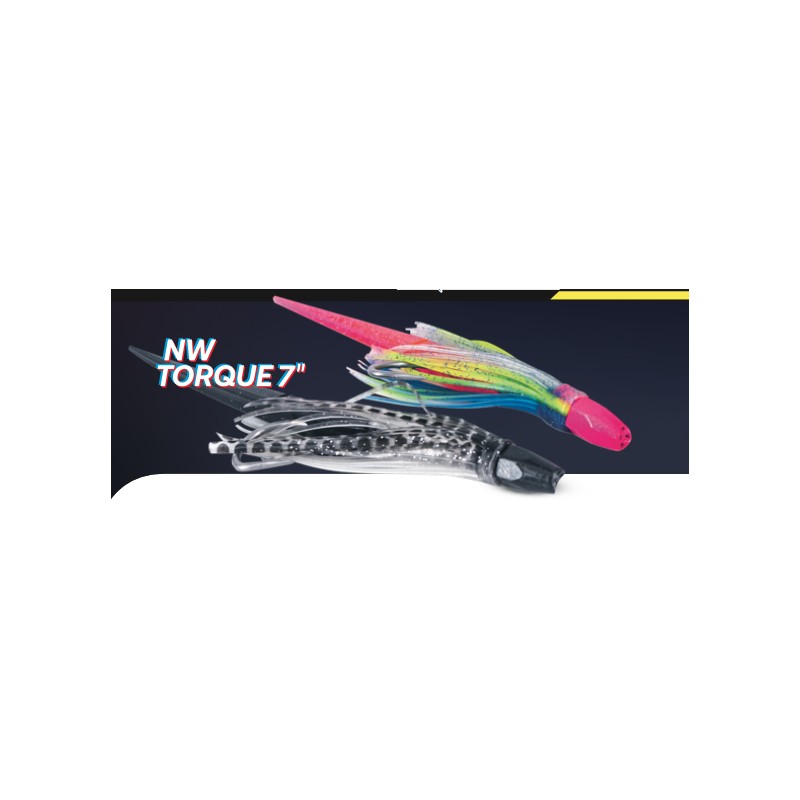 NW TORQUE è un artificiale dedicato alla pesca a traina d'altura con corpo in silicone e testa in ottone forato che lo rende molto attrattivo quando trainato, armato con amo Mustad.