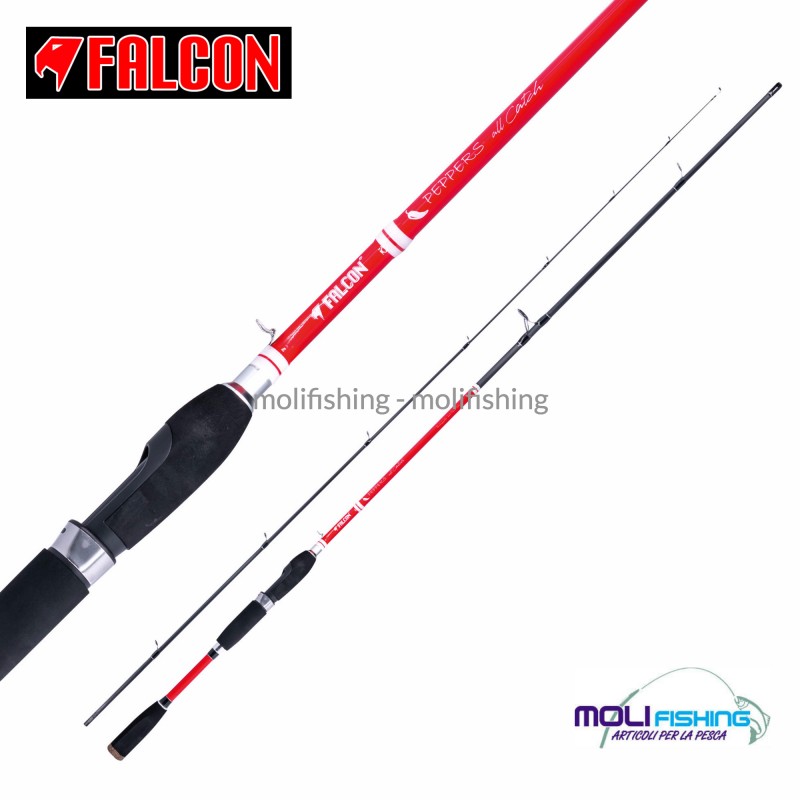 La Falcon Peppers All Catch è una canna da spinning che trova impiego in diversi scenari di pesca alla ricerca di diversi tipi di prede, da questa combinazione deriva appunto il suo nome All Catch. Si tratta di un attrezzo in carbonio 8 piedi, proposto in tre differenti grammature 3/15 - 10/20 e 14/42 gr dotato di vette sensibilissime ed una azione del fusto progressiva che permette di manovrare facilmente gli artificiali.