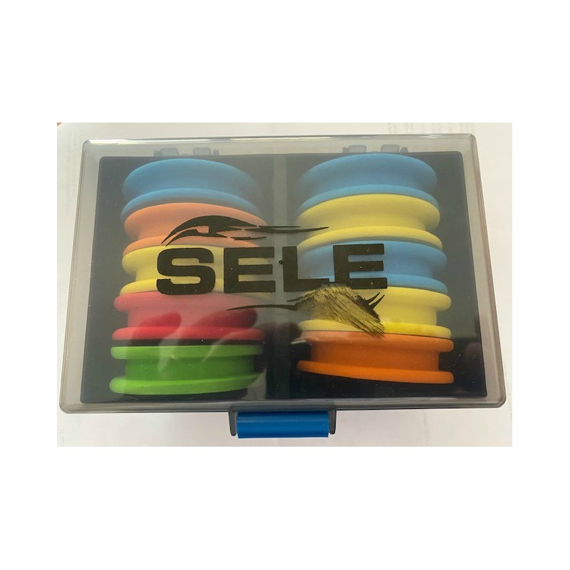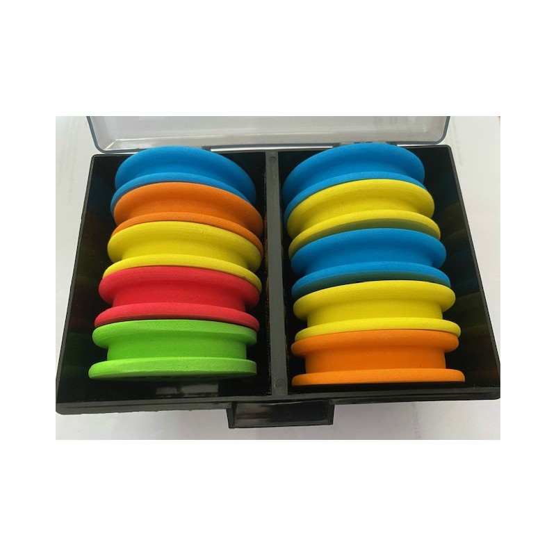 Box in plastica rigida con coperchio con protezione raggi UV, coperchio con chiusura a scatto con all'interno 10 avvolgilenza in neoprene di diametro di 6 cm, ideale per riporre le montature per la pesca surfcasting, bolentino, carpfishing.