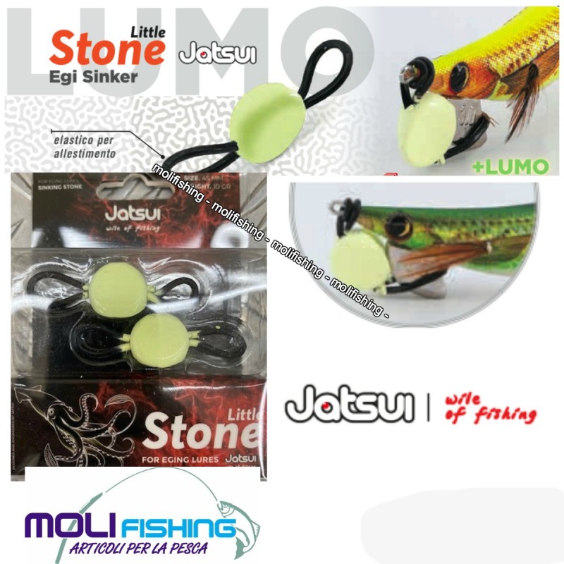 Little Stone della Jatsui è una zavorra aggiuntiva per totanare con rivestimento "LUMO", di facile allestimento grazie agli elastici che ne garantiscono tenuta nel tempo e ne facilitano l'allestimento sul nostro artificiale. La zavorra plasmata per alloggiare perfettamente sul piombo a lama del nostro Egi ci aiuta ad aumentare sostanzialmente la distanza di lancio senza alterare il movimento dell'artificiale in fase di pesca. Ideale per Deep Egi - Kabo Squid - Sea Egi della Eging Jatsui