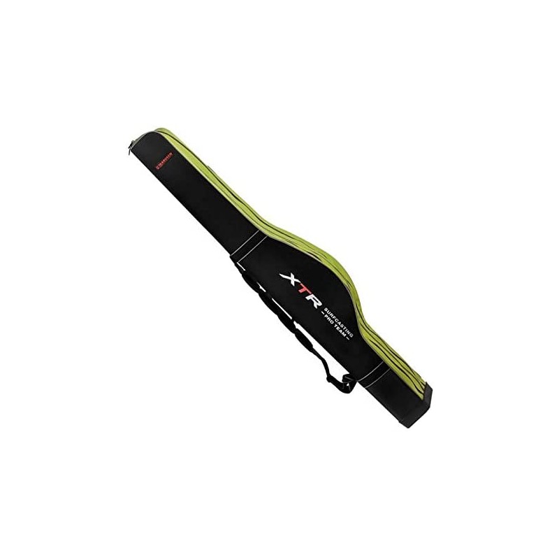 Comodissimo fodero a doppio scomparto con base rinforzata in plastica e una pancia, per permettere di trasportare le nostre canne su ogni superficie senza dover smontare i mulinelli dalla canna, favorendo una maggiore velocità di allestimento per la postazione di pesca. Completamente realizzato in tessuto impermeabile e lavabile pesante ben 1200 denari, con imbottiture e cerniere rinforzate. Fodero molto comodo da trasportare grazie alle imbottiture degli spallacci, consigliato per chi pratica il Surf Casting e Beach Ledgering vuole proteggere la propria attrezzatura che essendo molto delicata, ha bisogno di un fodero molto resistente agli urti e che limiti al minimo i movimenti dell'attrezzatura all'interno. Adattabile a canne di altezza massima di 180 cm (Bolognese, Inglese,) Al lato una comodissima tasca lunga porta picchetto o accessori di grande ingombro come manici di guadino.